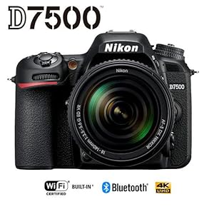 Master the Light Add balance, depth and drama to your images with the D7500’s built-in flash, which uses detailed, in-camera scene analysis to add just the right amount of light to your subject. Ready to get even more creative with light? The D7500 has wireless commander capability with up to 2 groups (A/B) of line-of-sight Speedlights or 3 groups (C/D/E) of radio-controlled Speedlights*. *With optional WR-R10 wireless remote controller and SB-5000 Speedlight(s). | 4K ultra HD Video If you’ve been itching to enter the world of filmmaking, the D7500 is your gateway DSLR. Record rich and detailed 4K Ultra HD or Full HD videos up to 29 minutes 59 seconds through industry-leading NIKKOR lenses while using pro-level video features like power aperture control to adjust aperture while recording and touch focus control. Create beautiful 4K Ultra HD time-lapse movies. Movies can be recorded in MP4 or the conventional MOV format, allowing easy playback on smart devices. The D7500 adjusts to your creative workflow with the freedom to record to an external device, the camera’s memory card or both simultaneously. | Connected to your World Share your most impressive shots with the world the minute you take them. Install Nikon's SnapBridge app on a compatible phone or tablet and connect to the D7500 for instant photo sharing, automatic backups and even remote camera triggering—great for wildlife shooting, parties, self portraits and group shots with you in them. | Creativity on Demand Beyond its outstanding image capture, the D7500 includes powerful performance enhancing features. In-camera batch processing improves handling of large numbers of RAW images. Auto AF fine-tune in Live View is also inherited from the D500 to simplify adjustment for minor variations between the camera and lens. Advanced Picture Control tools, including a new Auto option; Auto ISO in Manual Mode and Zebra stripes for detecting overblown highlights help you take full creative control. A new and improved multiple exposure feature gives you the choice of saving each individual frame in addition to the final composited image. |