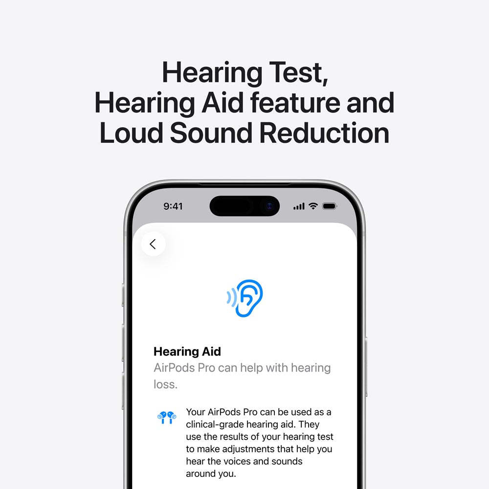 6 The Hearing Test and Hearing Aid features are supported on AirPods Pro 2 and later with the latest firmware paired with a compatible iPhone or iPad with iOS 18 or iPadOS 18 and later and are intended for people 18 years old or older. The Hearing Aid feature is also supported on a compatible Mac with macOS Sequoia and later. It is intended for people with perceived mild to moderate hearing loss. Some features may not be available in all regions or all languages. See apple.com/sg/airpods-pro/feature-availability for complete list.