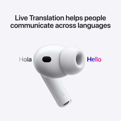 4 Live Translation with AirPods works on AirPods 4 with Active Noise Cancellation and AirPods Pro 2 and later with the latest firmware when paired with an Apple Intelligence–enabled iPhone running iOS 26 and later. Supports English (UK, US), French (France), German, Portuguese (Brazil) and Spanish (Spain). For more information, see apple.com/sg/ios/feature-availability.